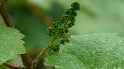 Die herzförmigen Blätter sind wechselständig angeordnet, mehrfach gelappt mit unregelmäßig gezähntem Blattrand. Die kleinen grünlich- gelben Blüten wirken als einzelne Blüte betrachtet unscheinbar, im Verbund als längliche Rispe sind sie jedoch als üppiger Blütenstand wahrnehmbar. Aus ihnen entwickeln sich dann in einem Reifungsprozess die fleischigen Beeren - die Weintrauben.